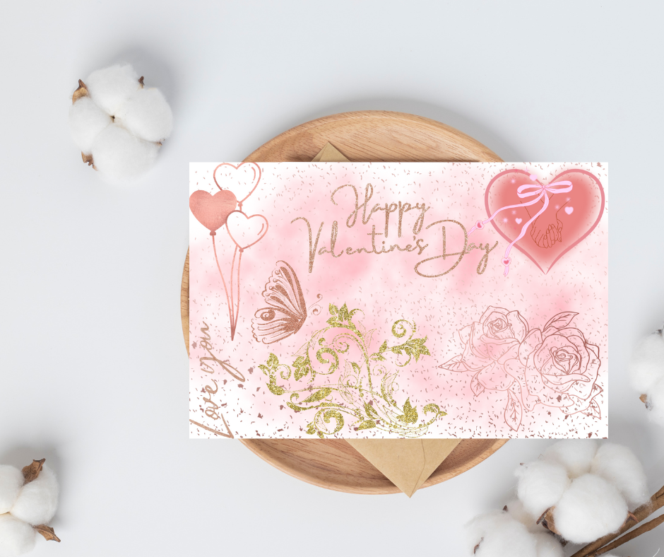 * Design: Features watercolor floral elements, a butterfly, and the phrase "Happy Valentine's Day" in elegant calligraphy.